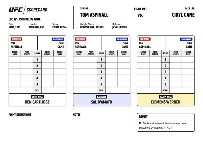 Scorecard : World Title - Poids Lourds : Tom Aspinall vs. Ciryl Gane - UFC 321 - ASPINALL VS. GANE